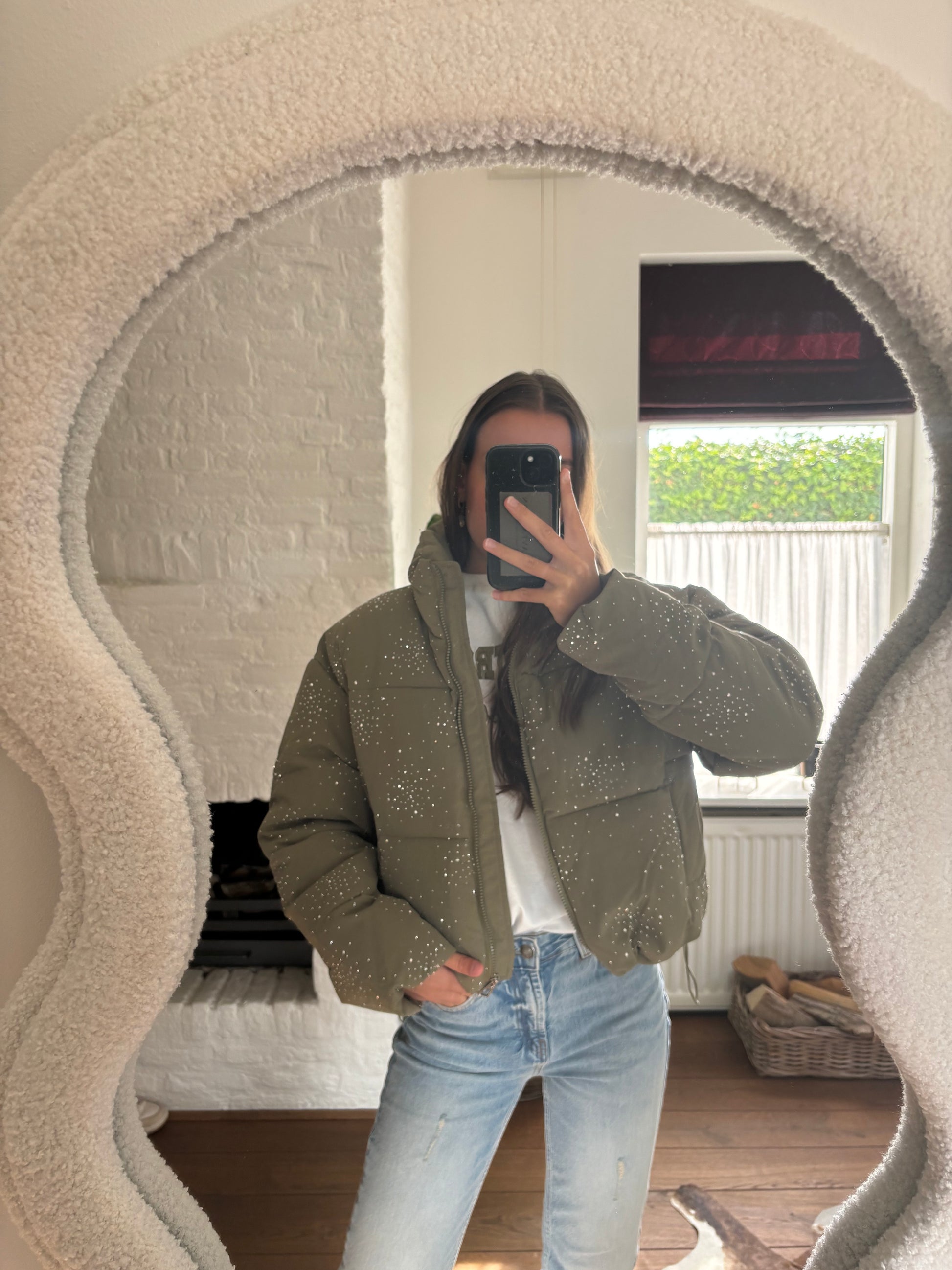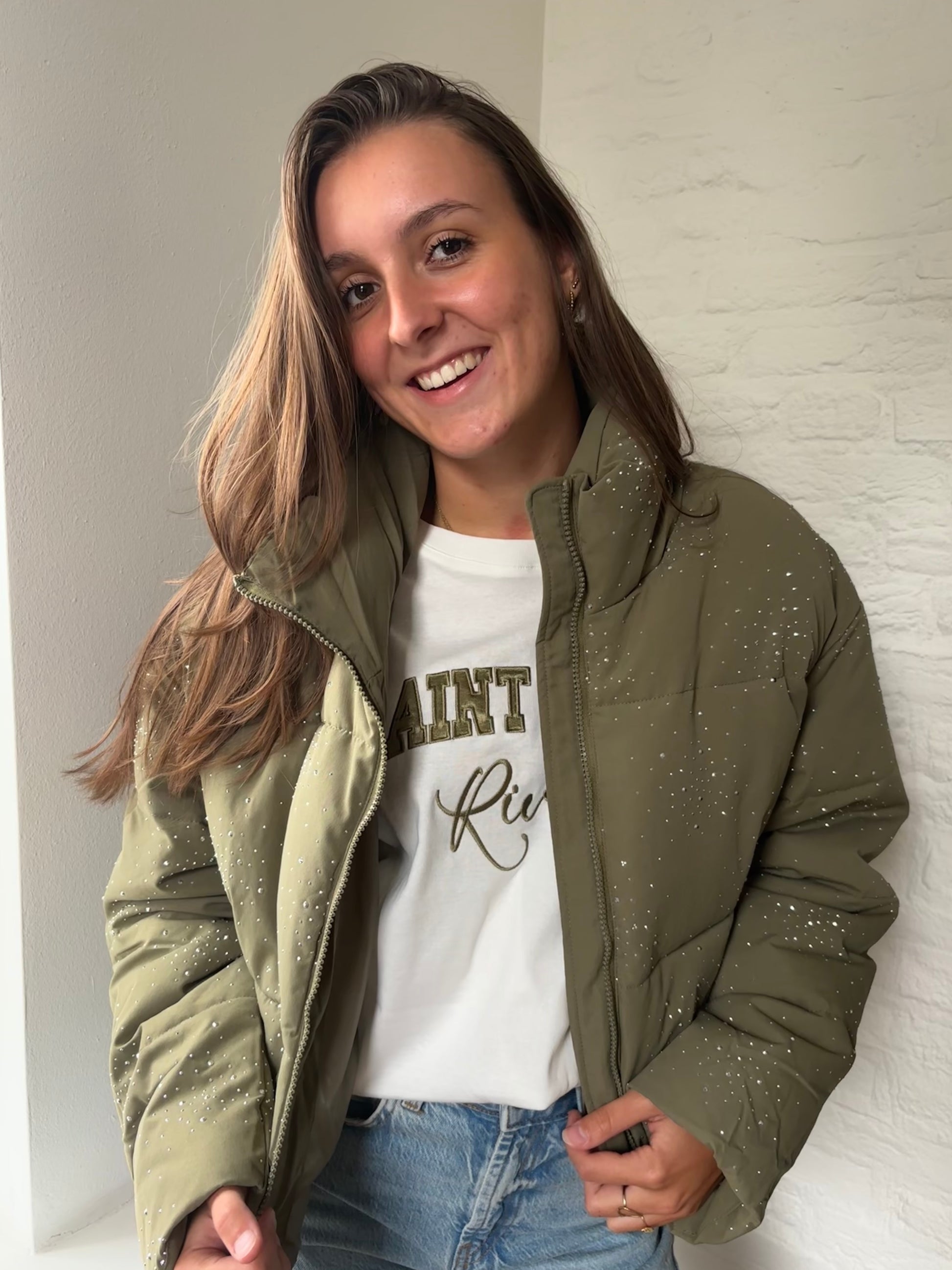 De glitter pufferjas is een stoere jas in kaki met stras/glitter steentjes. De warme voering en hoge kraag zorgen voor extra comfort tijdens koude dagen. Combineer ‘m met het groene Ambika shirt Saint Tropez en jeans voor een stijlvolle winter look.