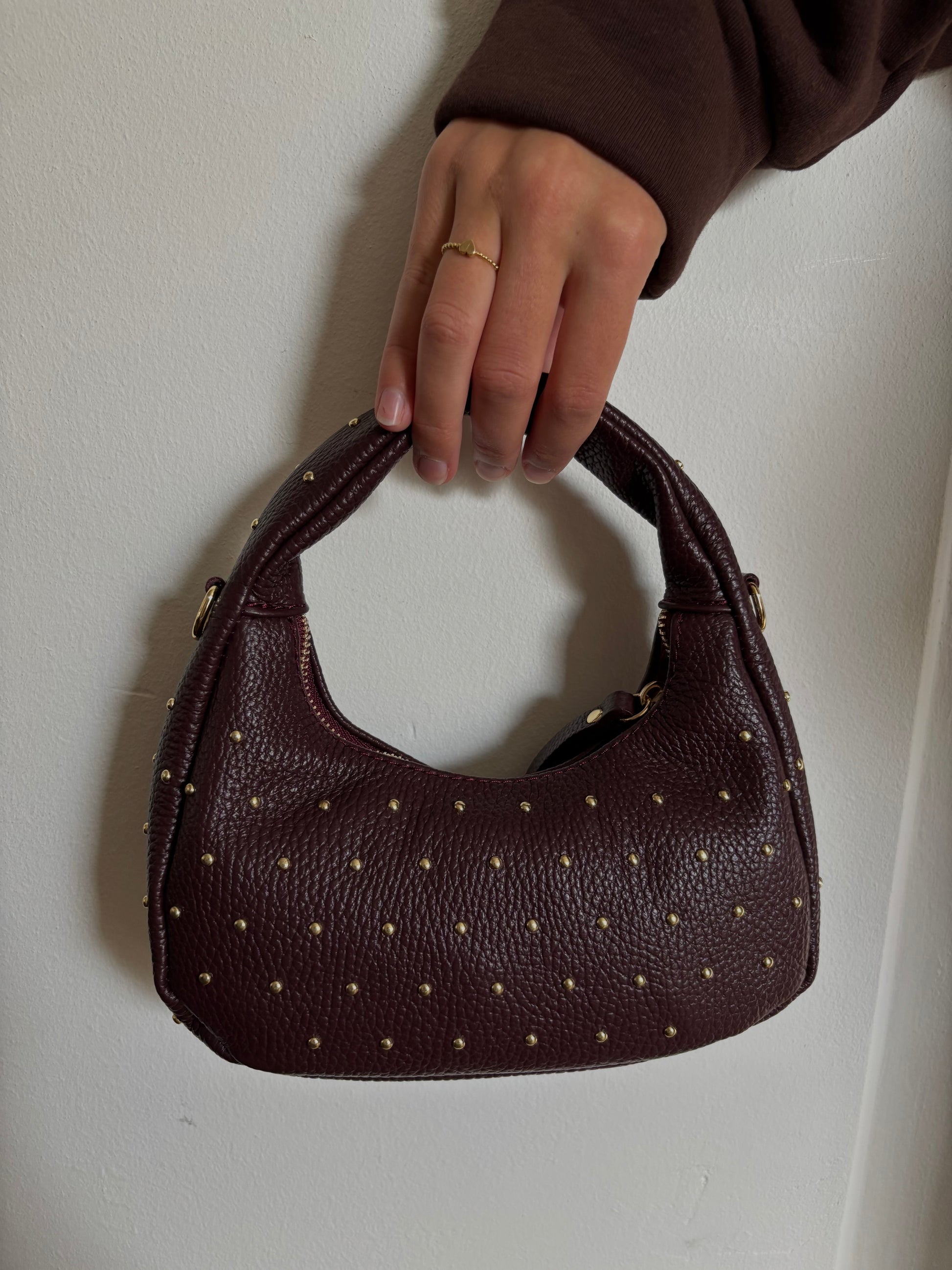 Trend alert! Deze bordeaux rode leren handtas met gouden studs is een must-have. Dankzij het losse hengsel draag je ‘m ook makkelijk crossbody voor een stijlvolle en praktische look, perfect voor elke gelegenheid.